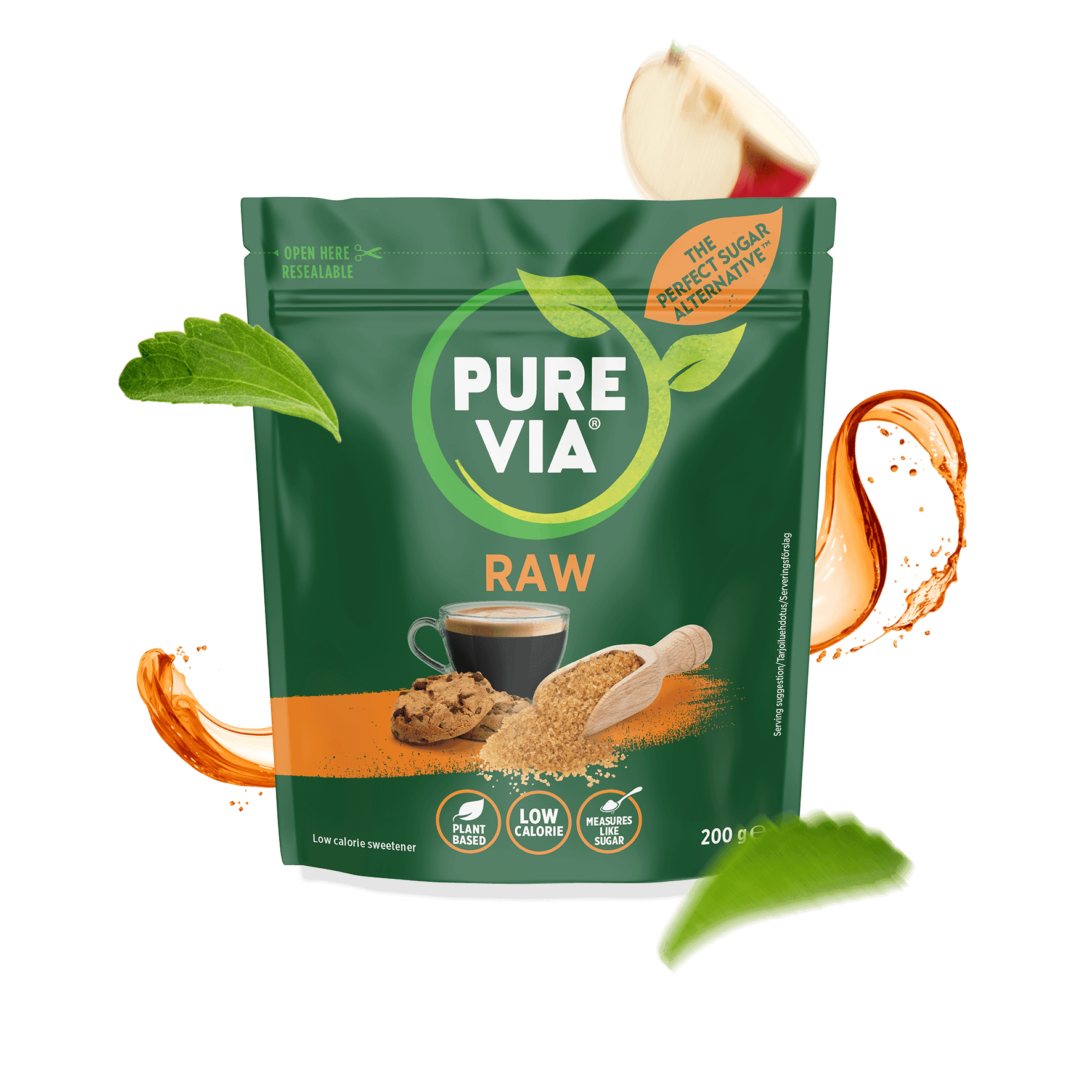 Vaihtoehtoomme raakasokerille on käytetty vain neljää kasvipohjaista raaka-ainetta: erytritolia, omenauutetta, luontaisia aromeja ja steviakasvista saatuja stevioliglykosidejä. Omenat tuottavat ainutlaatuisen kullansävyn, jonka vuoksi Pure Via® Raw sopii erinomaisesti leivontaan ja ripoteltavaksi ruoan pinnalle. Se myös täydentää täyteläisten ja voimakkaiden tee- ja kahvilaatujen makua erinomaisesti.